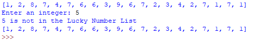 The remainder of the Lab assignment further covered if statements, else statements and while loops. Incorporating these functions, we were tasked with compiling a program of "lucky numbers" that started by populating a list of 20 randomly generated numbers between zero and ten. Then an "unlucky number" was selected by user-input, which in turn was iterated through the program to determine if it was on the list, and if so, how many times. If the unlucky number was, compiled code would remove any instance of that from the lucky number list. Results were printed.
